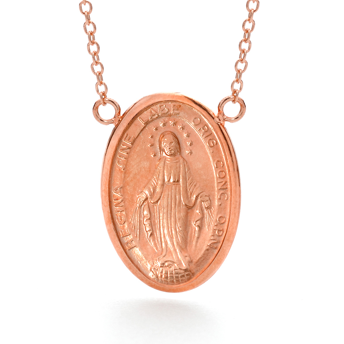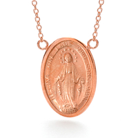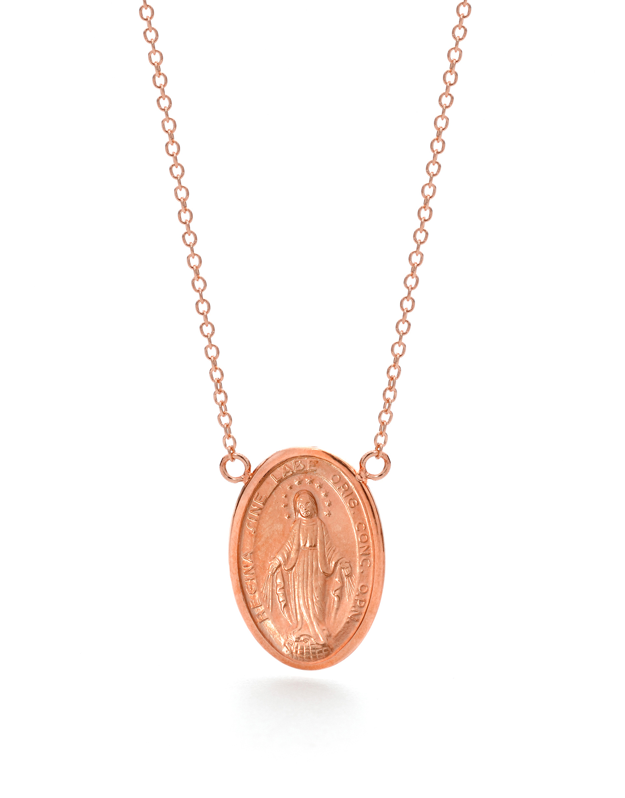 | Details | 18KT Rose Gold Necklace the relief of this medal represents the first apparition of the Virgin to St. Catherine Labouré. This is the reason why the Miraculous Medal has become a symbol of grace for those who will wear it. Offer it to the suffering, the sick and those who have no more faith. Made in Italy |