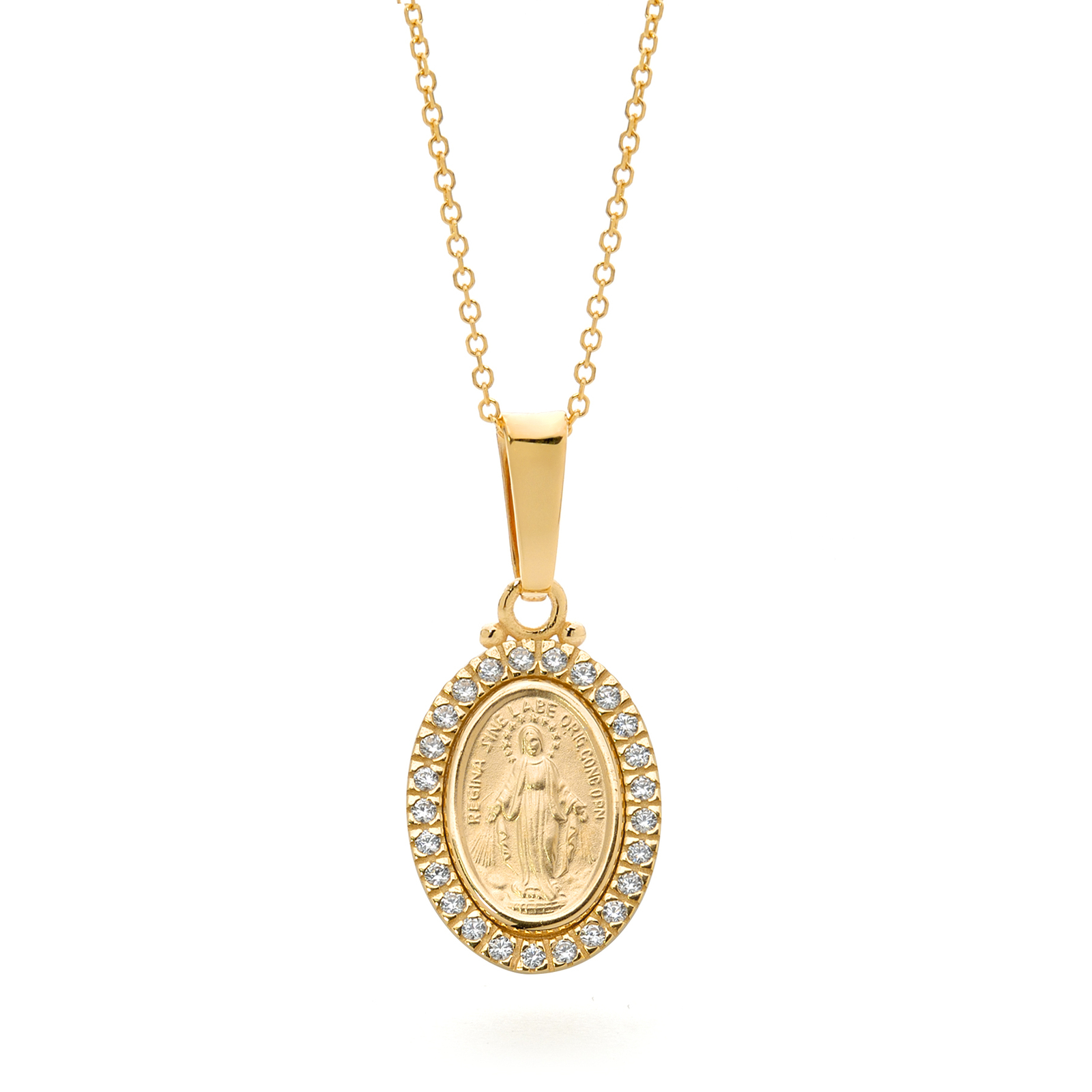 | Details | 18KT Yellow Gold Lady of Miraculous Diamond Medal Necklace. The relief of this medal represents the first apparition of the Virgin to St. Catherine Labouré. This is the reason why the Miraculous Medal has become a symbol of grace for those who will wear it. Offer it to the suffering, the sick and those who have no more faith. Made In Italy |