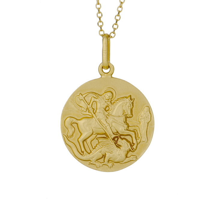 18KT Yellow Gold St George with in script on the back (St George pray for us), round shape is the patron Saint of soldiers, scouts and guides, for the symbology related to him of the good that defeats evil. He is depicted as a knight, who armed only with a spear and his faith, defeats the dragon. It protects you against poisonous snakes, battles, plague and leprosy.