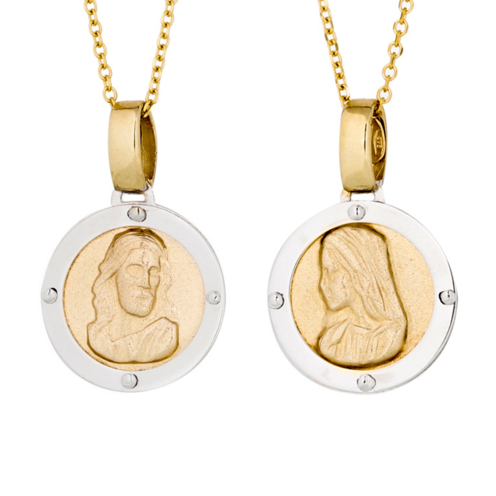 9KT Yellow/White Gold Jesus/Mary Pendant, round shape, depicts Mary Our Lady of Miraculous on the obverse, and the Sacred Heart of Jesus on the reverse.