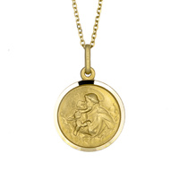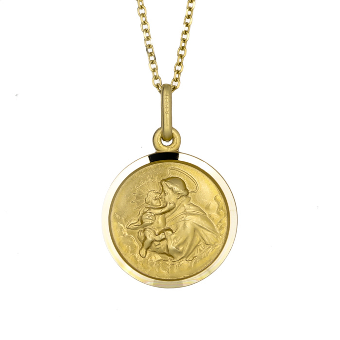 9KT Yellow Gold St Anthony, patronage: lost items, lost souls, poor people, Portugal and pregnant women, among others. Among the many miracles attributed to St Anthony of Padua there is the one depicted on this outstanding medal. Shortly before his death, Anthony of Padua retired to Camposampiero to spend some time praying in the hermitage provided by his friend, count Tiso. One night, passing by the hermitage, Tiso noticed a powerful light shining through the door of Anthony’s cell. Fearing the worst, he quickly opened the door only to find St Anthony holding the Baby Jesus in his arms. (Chain not included)