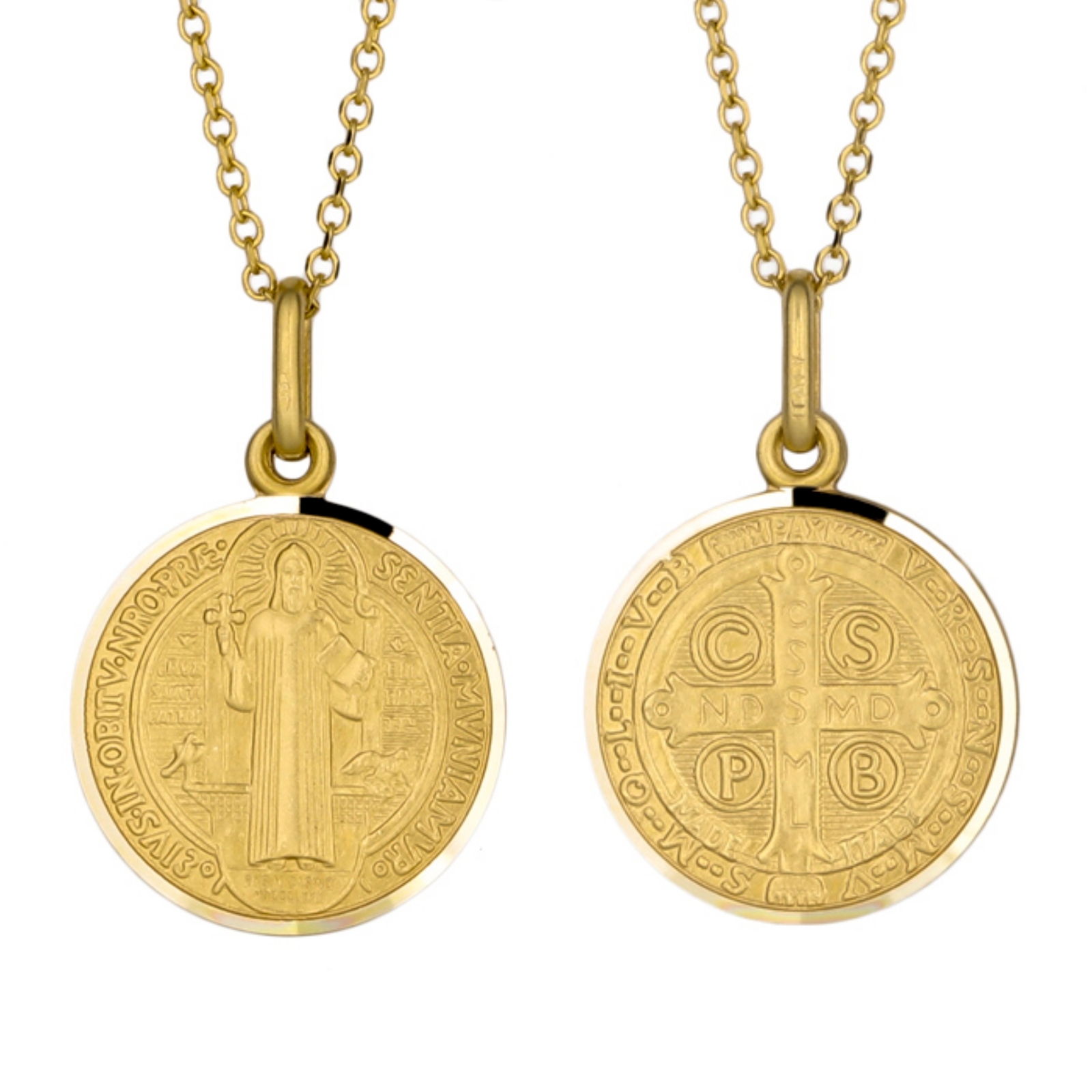 | Details | This Medal Pendant in 9KT Yellow Gold graces the legendary St Benedict medal, featuring the well- known Benedictine prayer of exorcism against Satan. (Chain not included) Made in Italy |