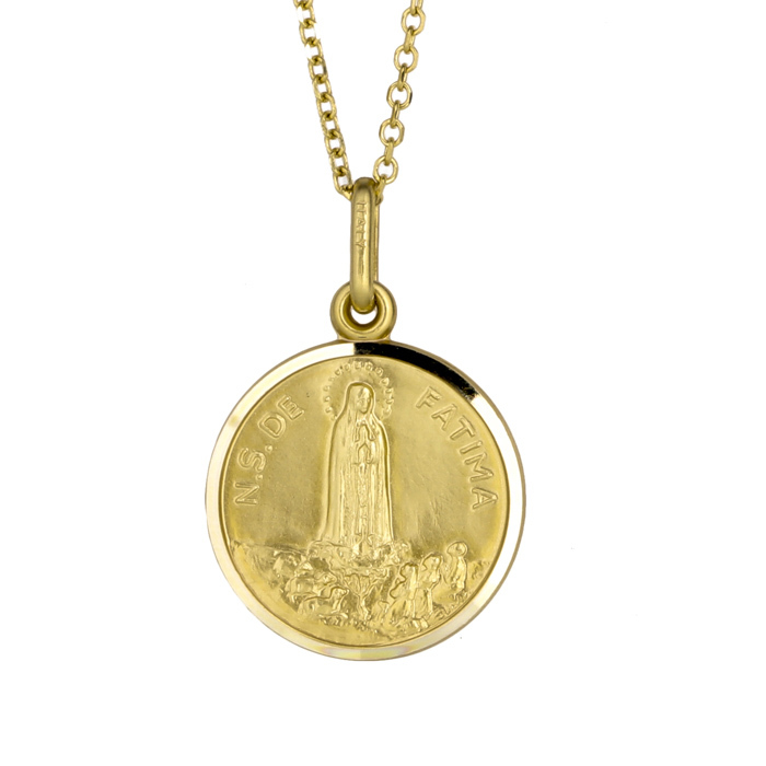 9KT Yellow Gold presents Our Lady of Fátima, who came with a message of love from God to every man, woman, and child and promised that many souls would go to Heaven if war, hunger and persecution of the Church were interrupted.