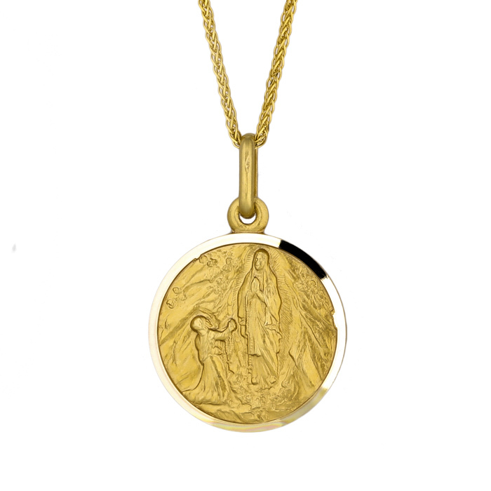 9KT Yellow Gold St Lourdes we can see the figure of the Virgin seen by young Bernadette in the cavern of the little town of Lourdes. A cold and dark place which stands to symbolize the presence of God who reaches us wherever we are. To wear it means to be always in contact with God.